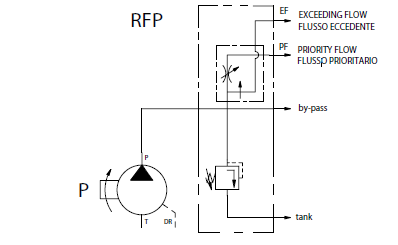 With the RFP version the exceeding flow is ‘recuperated’ back into the system and allows the use of two spools, the first spool has the ‘priority flow’ and the second spool has the ‘exceeding flow’.